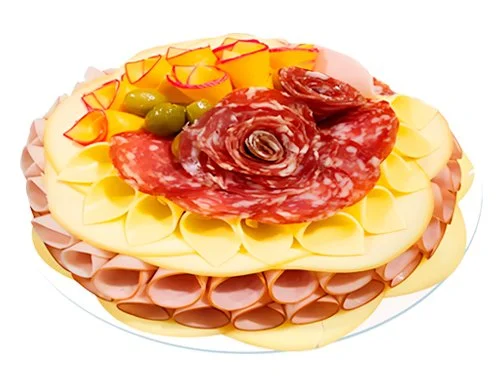 Peito peru defumado, peito peru cozido, queijo tipo Gouda, queijo prato, salame italiano, provolone, lombo canadense e azeitona verde sem caroço